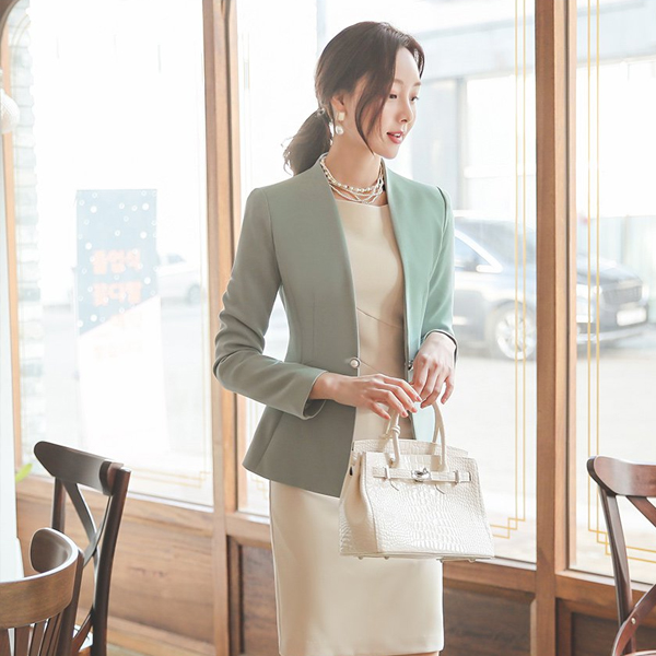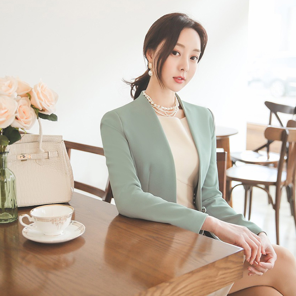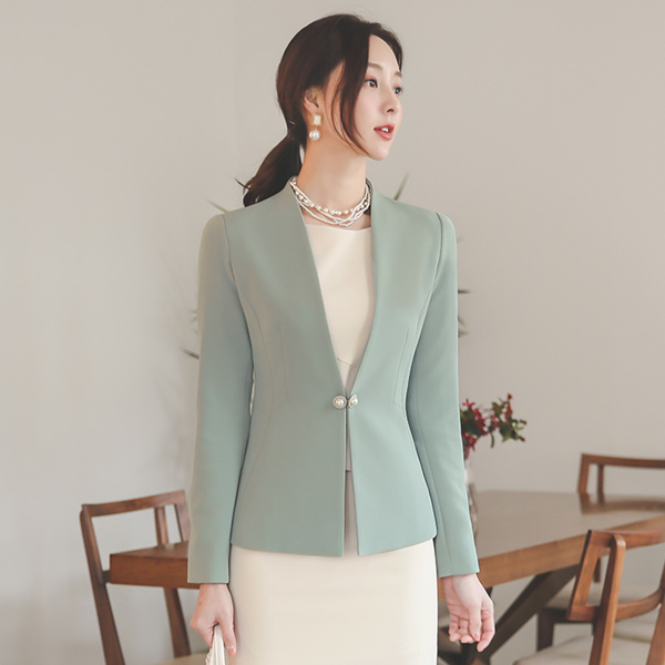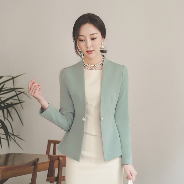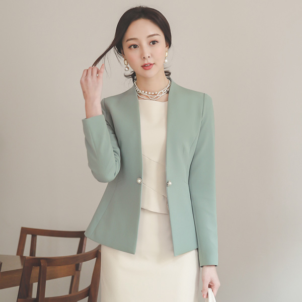 双 珍珠 装饰 无领 夹克