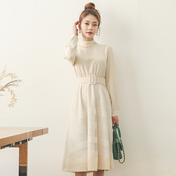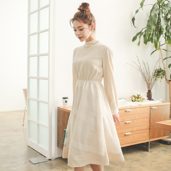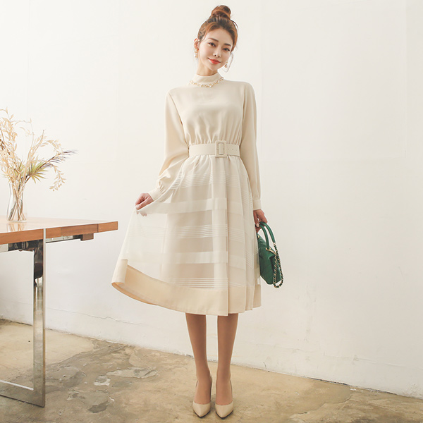 条纹 薄纱 配色 高龄 喇叭 连衣裙