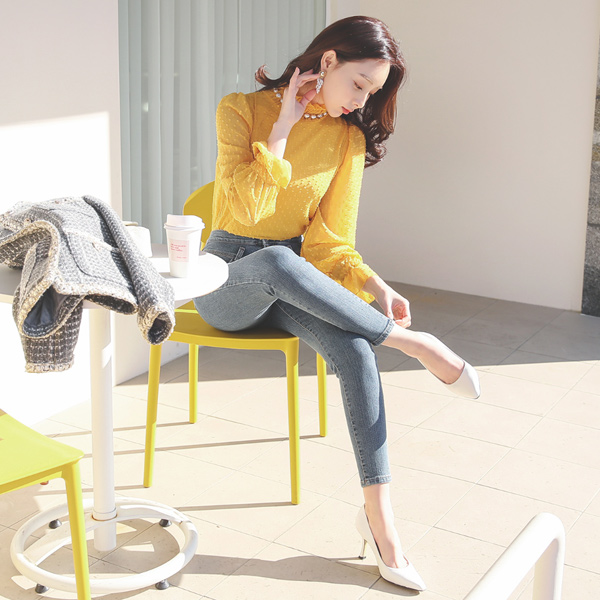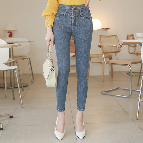高腰 三个 扣子 牛仔色 紧身裤(衬里加绒)