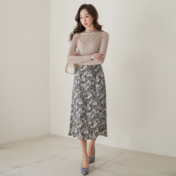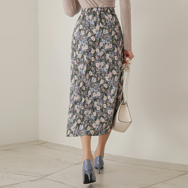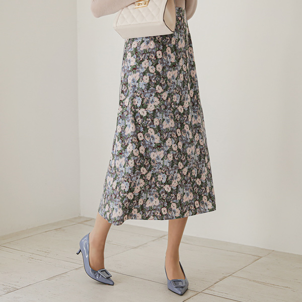 水彩画 花纹 印染 后侧松紧带 长款 裙子