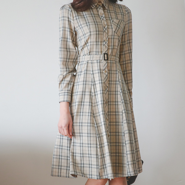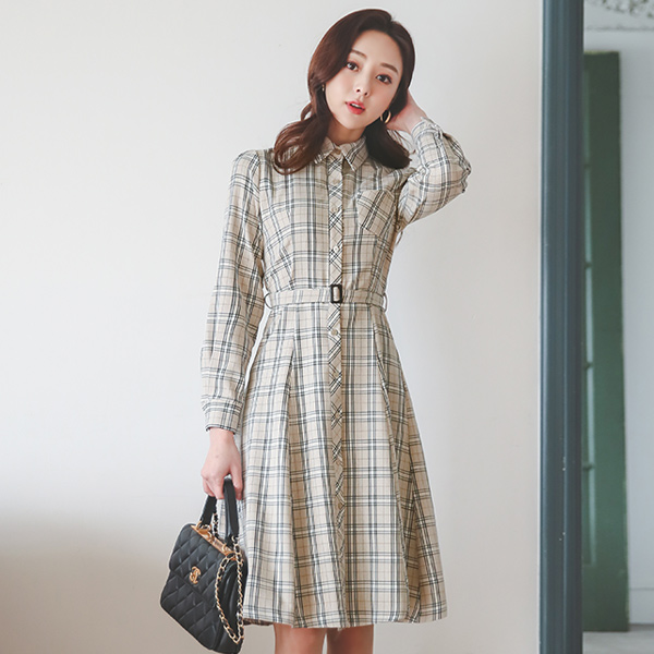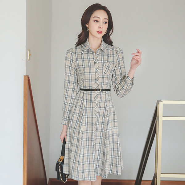格子配色 束带 领子衬衫 A字型 连衣裙