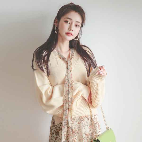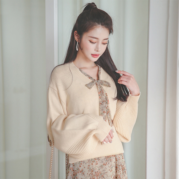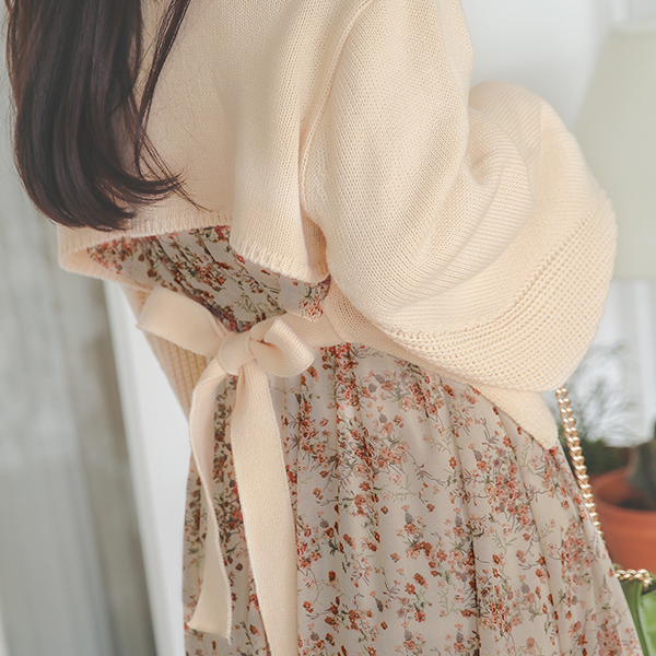 后面蝴蝶结 灯笼袖 V字领 7分裤 针织衫