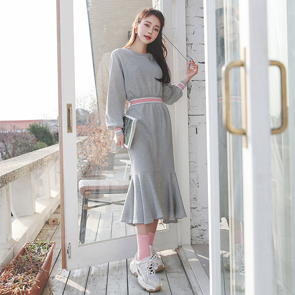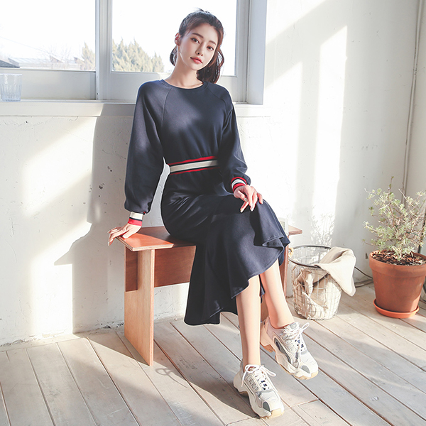 棉 配色 罗纹布 松紧带 长款 连衣裙