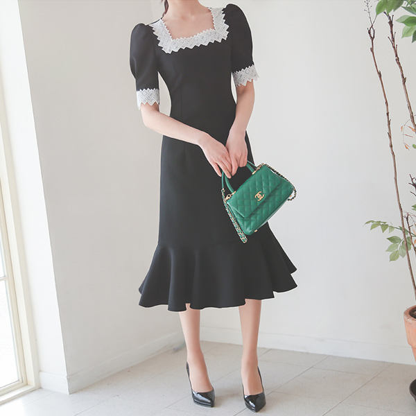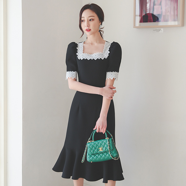 方领 蕾丝 缂丝 泡泡袖 褶裥 连衣裙