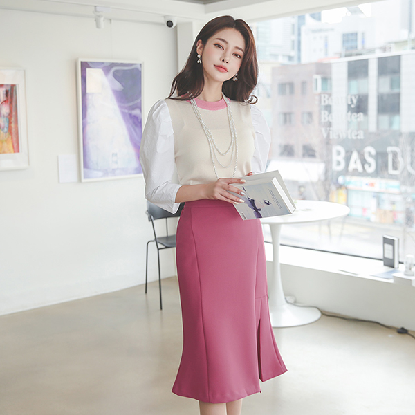 侧纽 褶边 三角襟 美人鱼 弹力 裙子