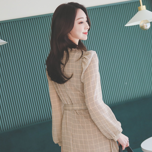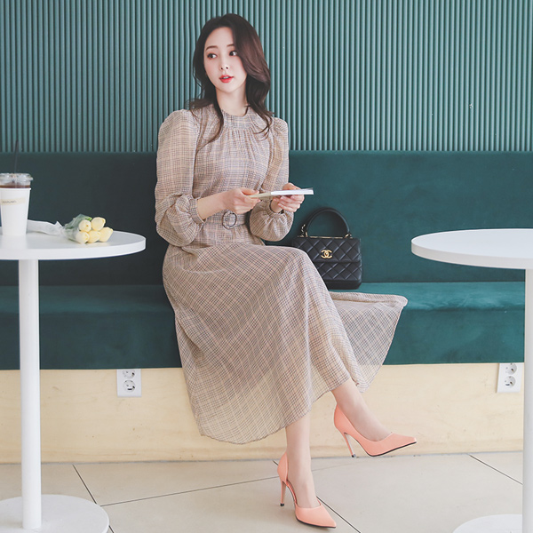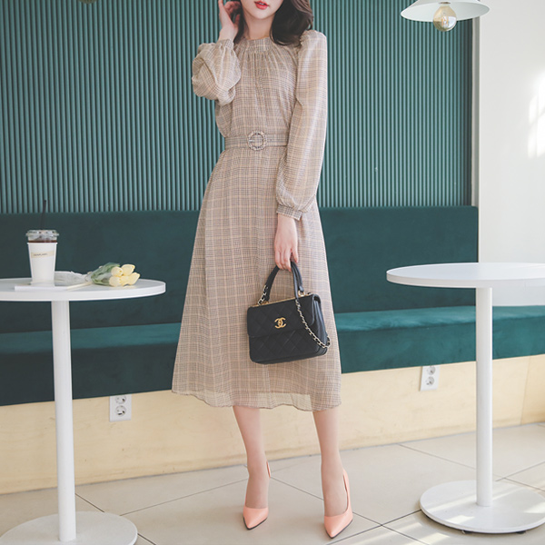 British 黑白格子 束带 褶皱 雪纺 连衣裙