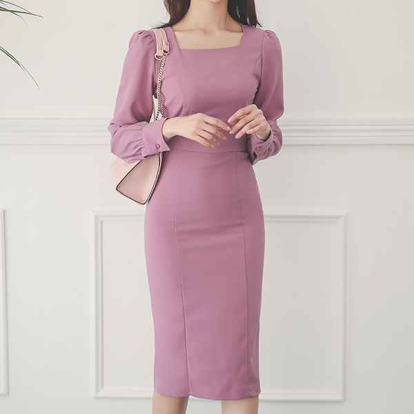 方领 挎包 褶皱 开叉线条 中长 连衣裙