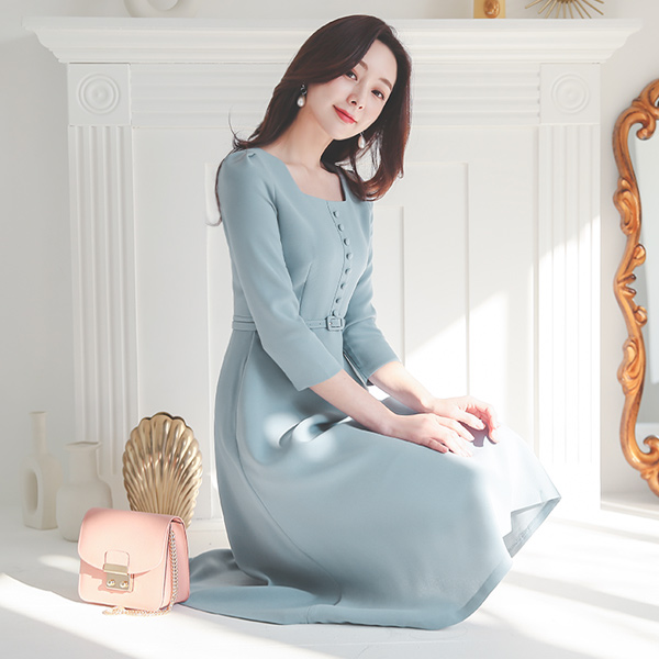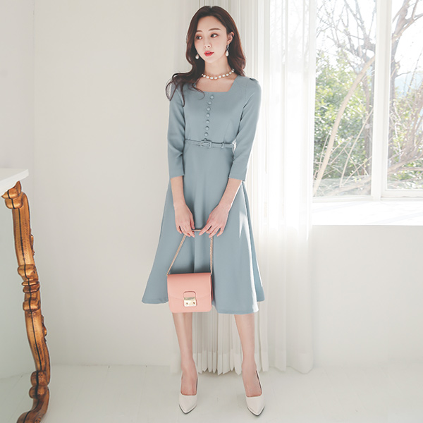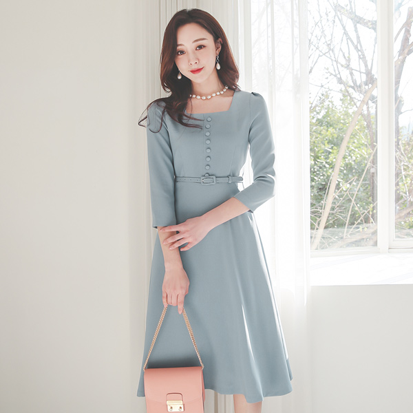 豆扣 束带 方领 喇叭 连衣裙