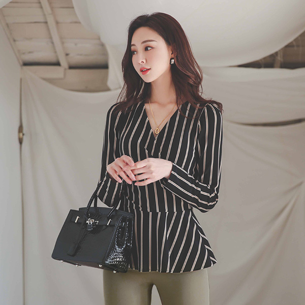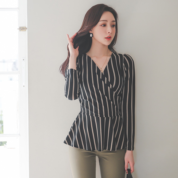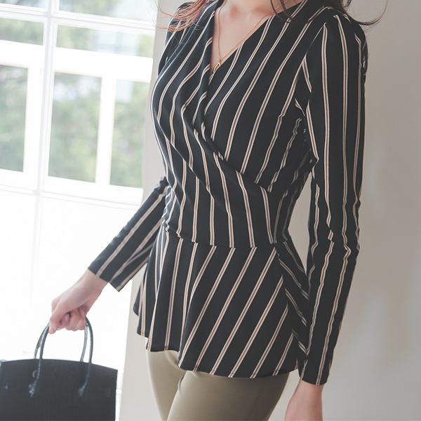 双色 条纹 裹身褶皱 喇叭 罩衫