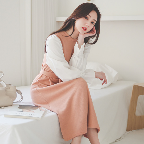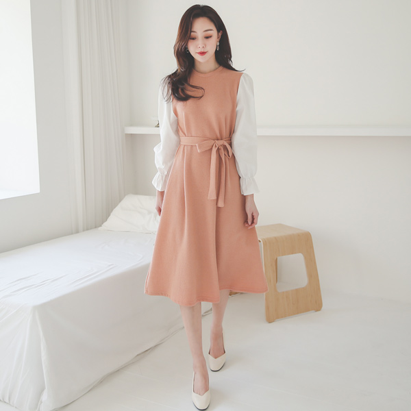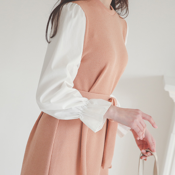 棉 袖 配色 针织衫 喇叭 连衣裙