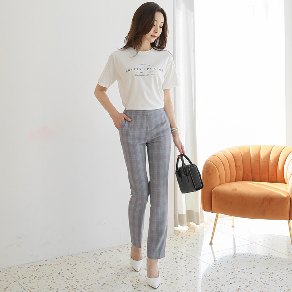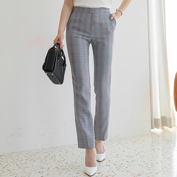 榛子 格子 腰头线条 一字型 弹力 宽松长裤