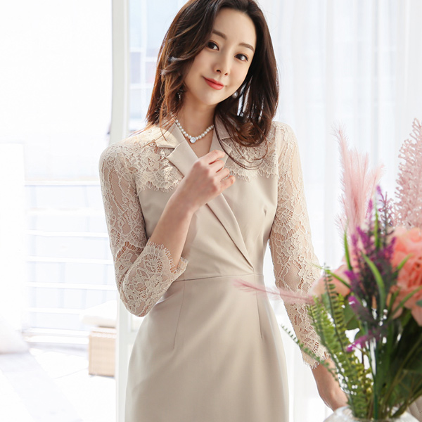 领子 裹身 蕾丝 配色 荷叶边线条 连衣裙