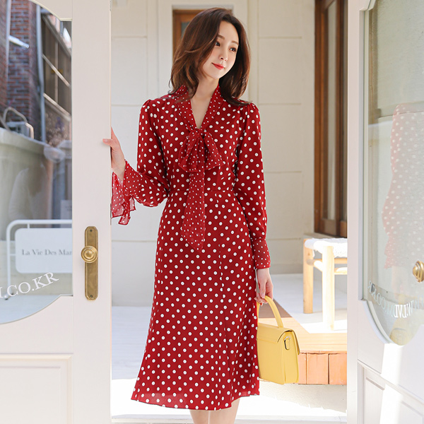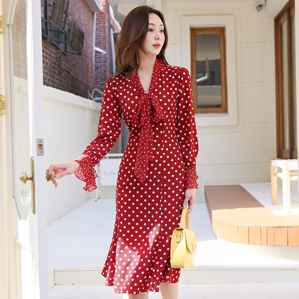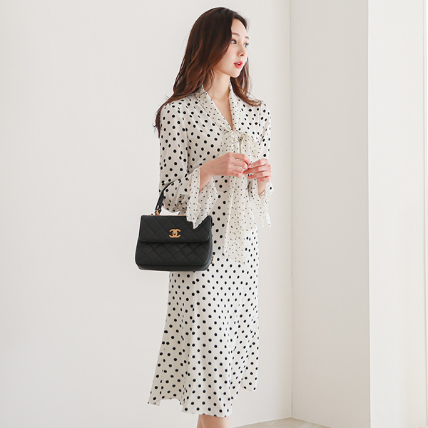 大圆点 宽松袖口 A字型 雪纺 连衣裙
