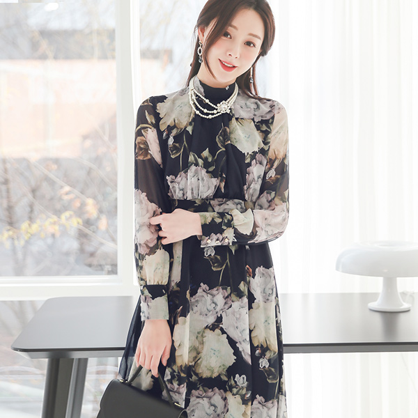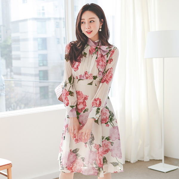 玫瑰色 蝴蝶结领结 雪纺 喇叭 连衣裙