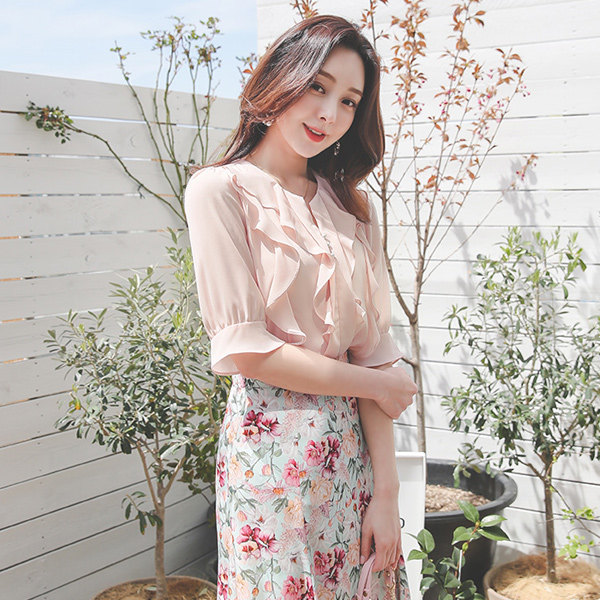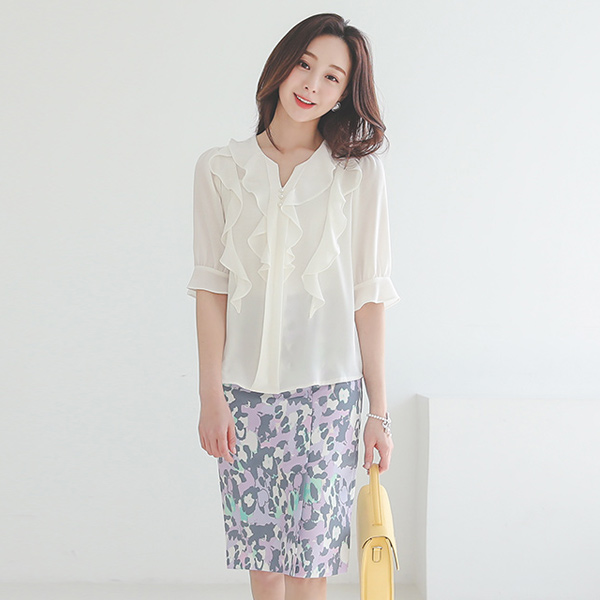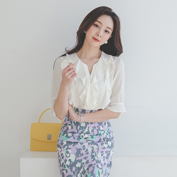 荷叶边线条 珍珠 v 开衩 圆领 罩衫