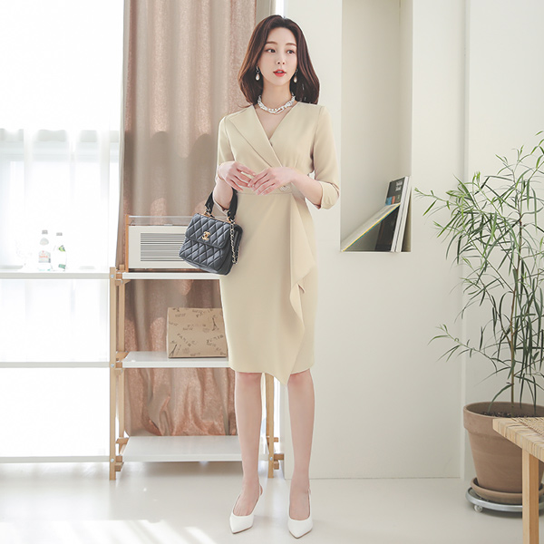 不规则 领子 Gold C戒指 荷叶边 连衣裙