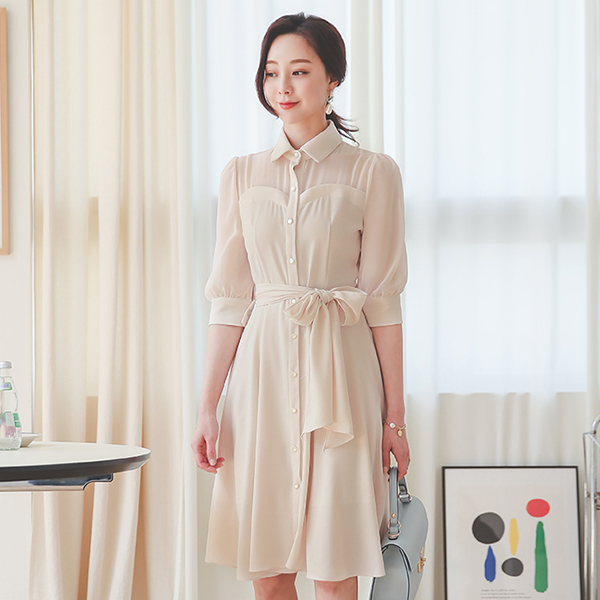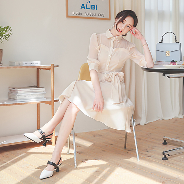 海利 透视 心形线条 束带 领子衬衫 连衣裙