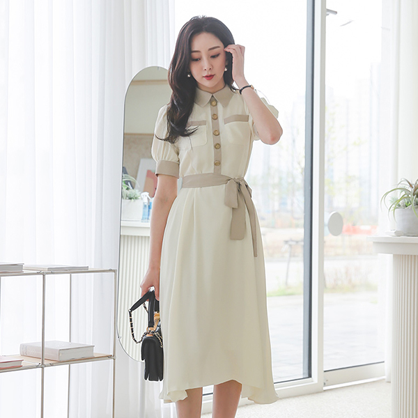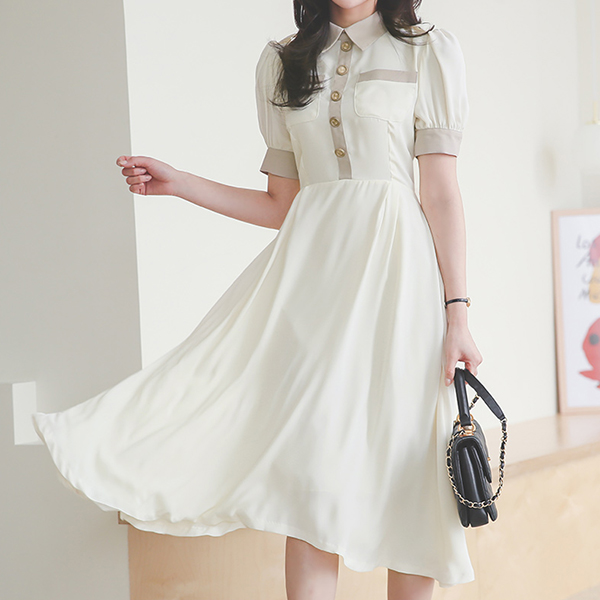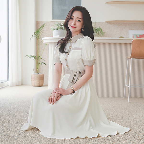 配色 泡泡袖 半袖 肩章 束带 长款 连衣裙