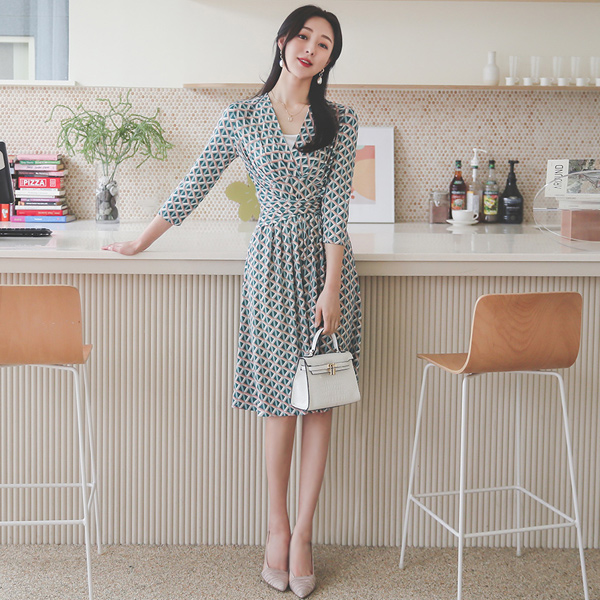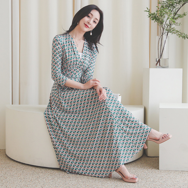 几何线 配色 图案 V字领 中长&超长 裹身 连衣裙