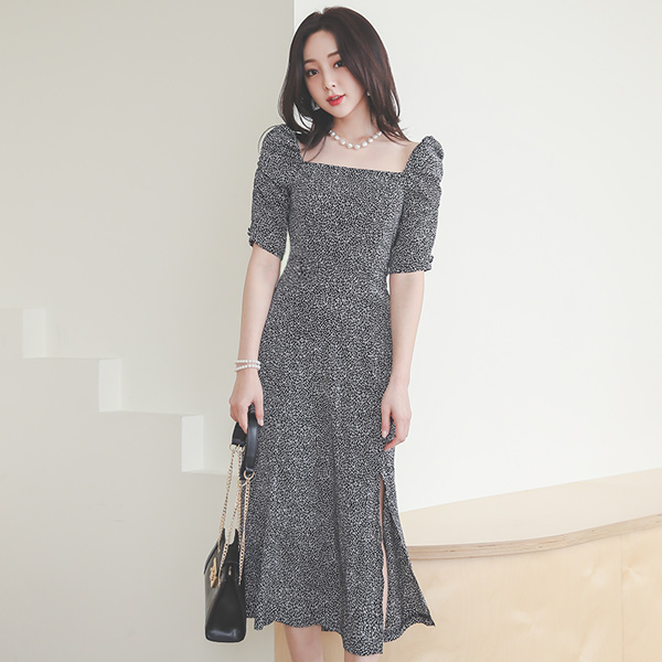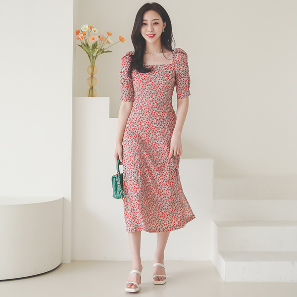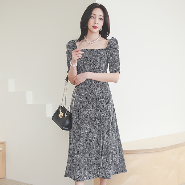 方领 褶饰 松紧带 A字型 印染 长款 连衣裙
