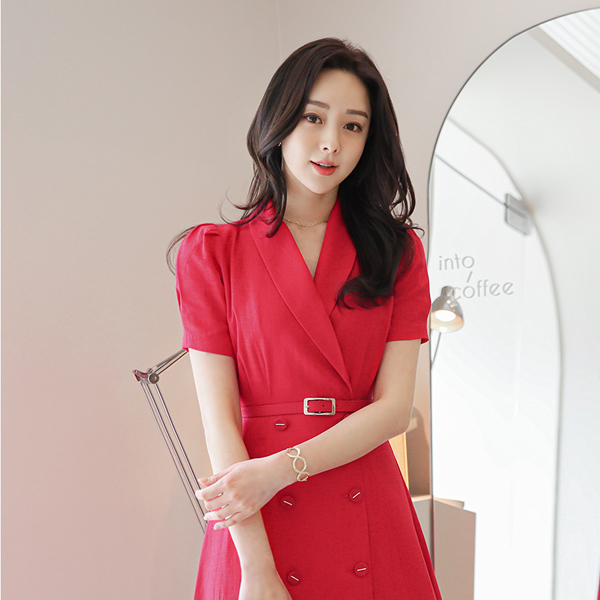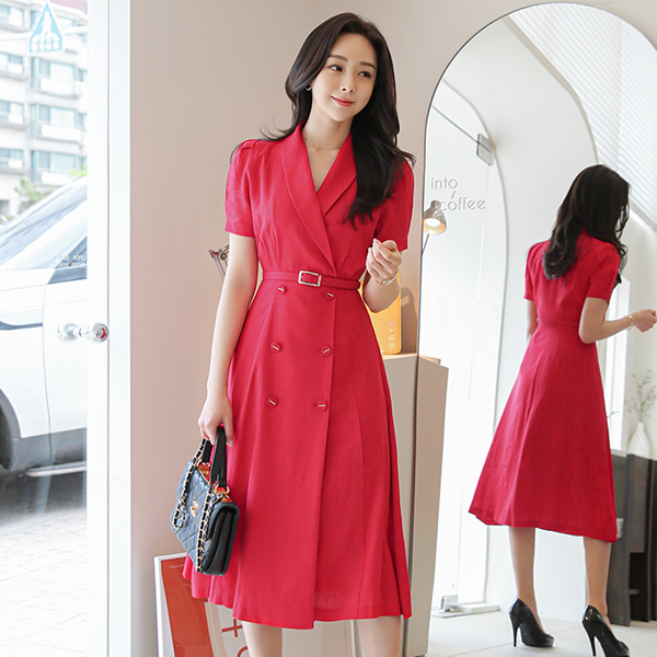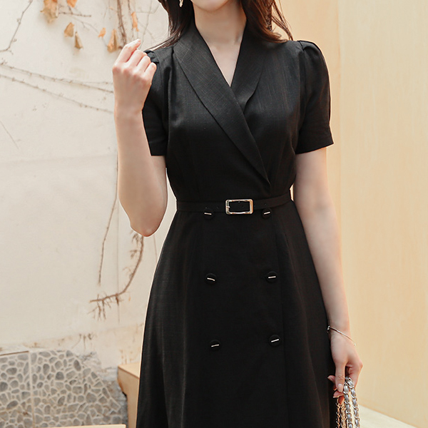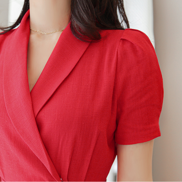 披巾领 泡泡袖 金条装饰 扣子 亚麻 连衣裙