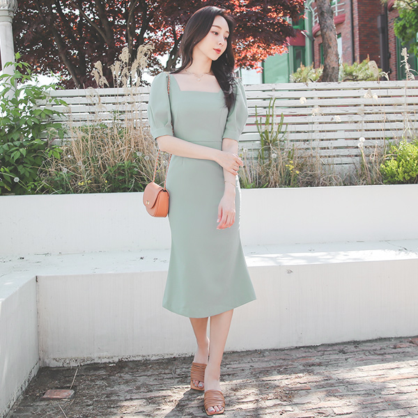 方领 泡泡袖 弹力 美人鱼 连衣裙
