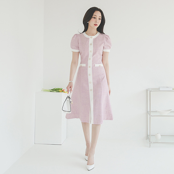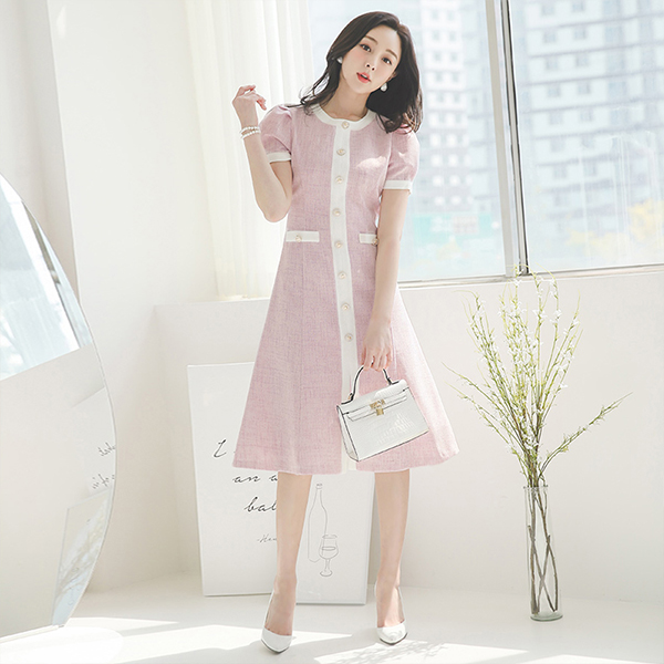 亚麻 质地 配色线 喇叭 连衣裙