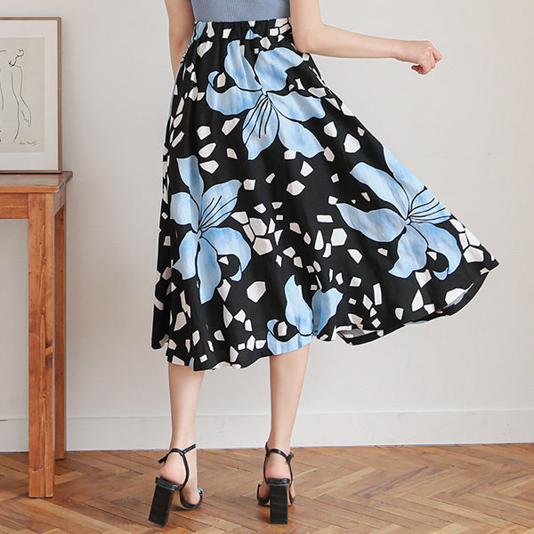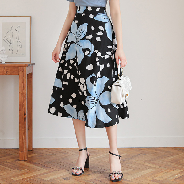块儿 花纹 印染 后侧松紧带 A字型 亚麻 裙子
