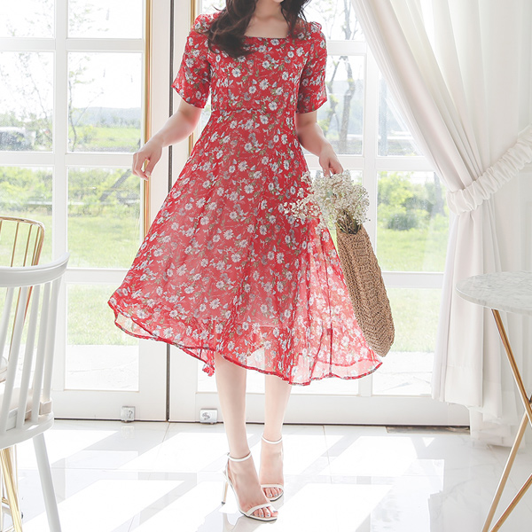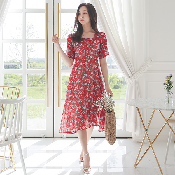 方领 褶皱衣袖 喇叭 雪纺 连衣裙