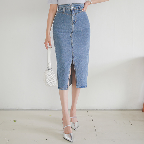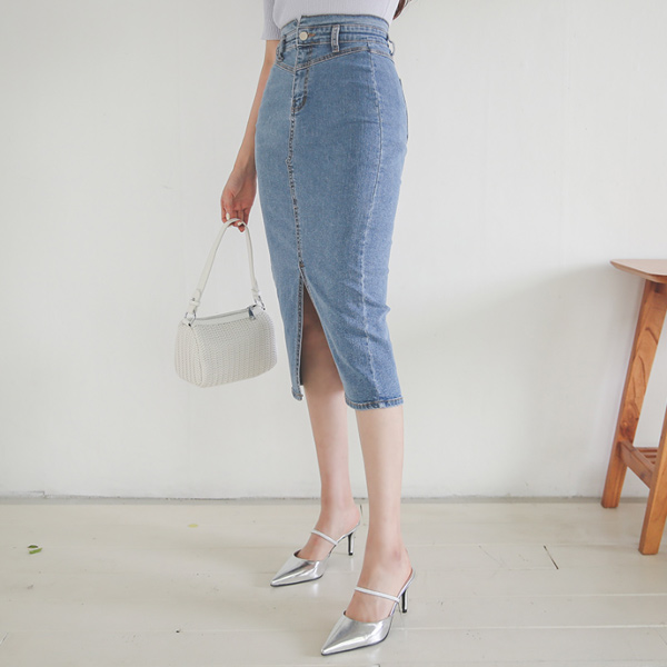 开叉 缝线 高腰 侧线开衩 弹力 牛仔色 裙子
