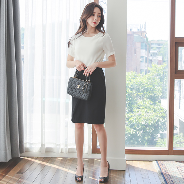 白色&黑色 芬奇 褶皱 配色 连衣裙