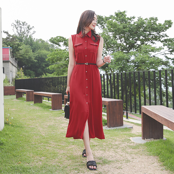 侧纽 开衩 Gold 束带 长衬衫 连衣裙