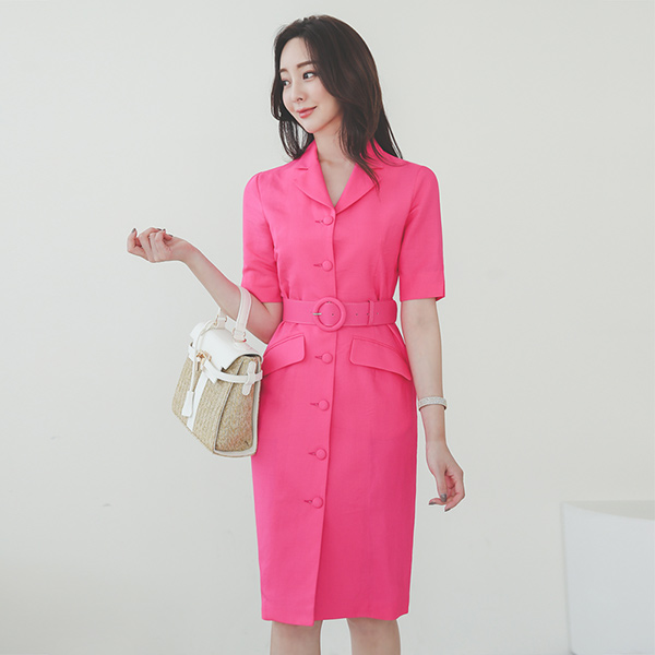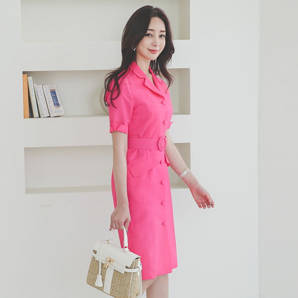 鲜明 亚麻 口袋 束带 衬衫 连衣裙