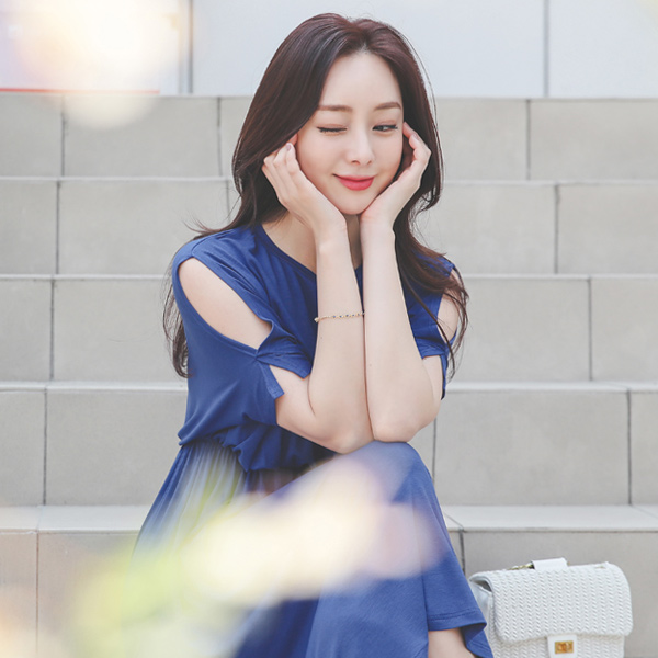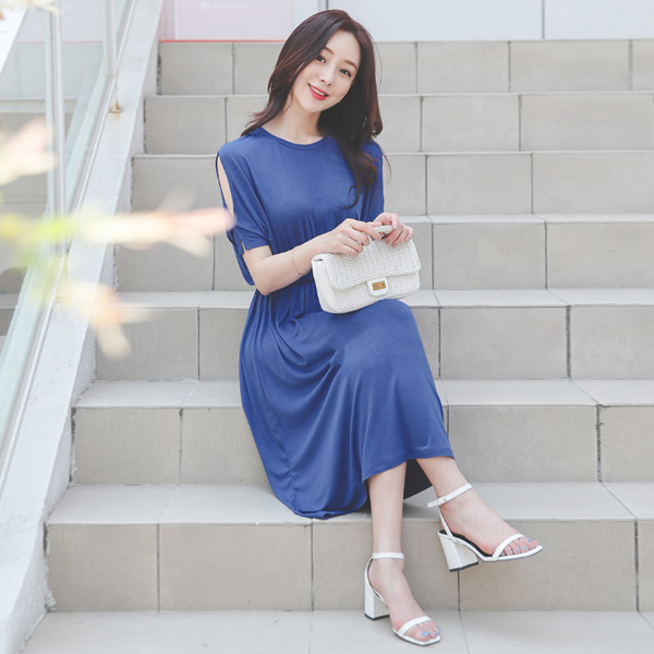 丝光纱 袖 开叉 松紧带 喇叭 连衣裙