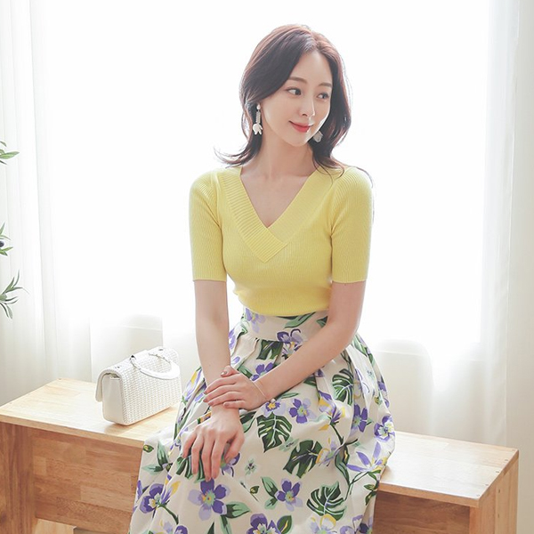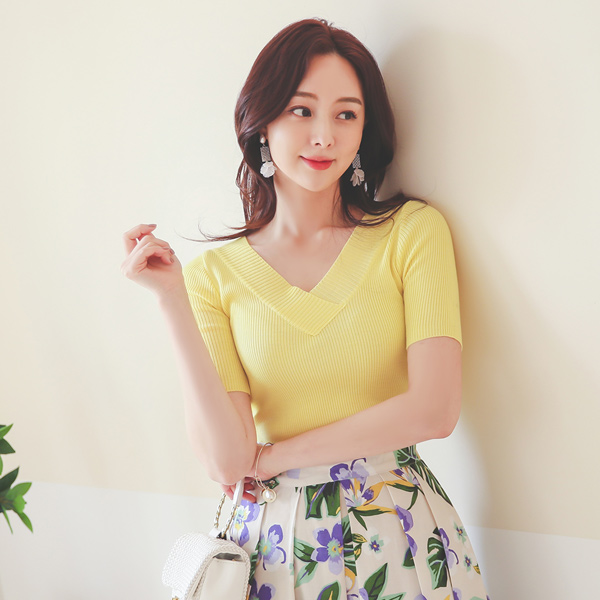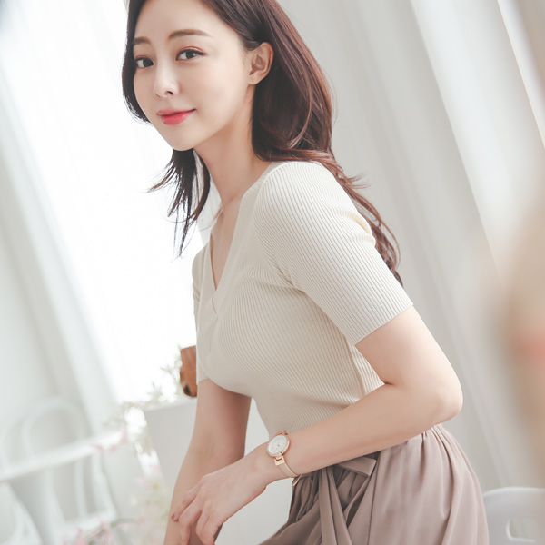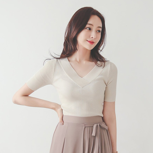 折叠V领 修身 条绒 针织衫(summer)