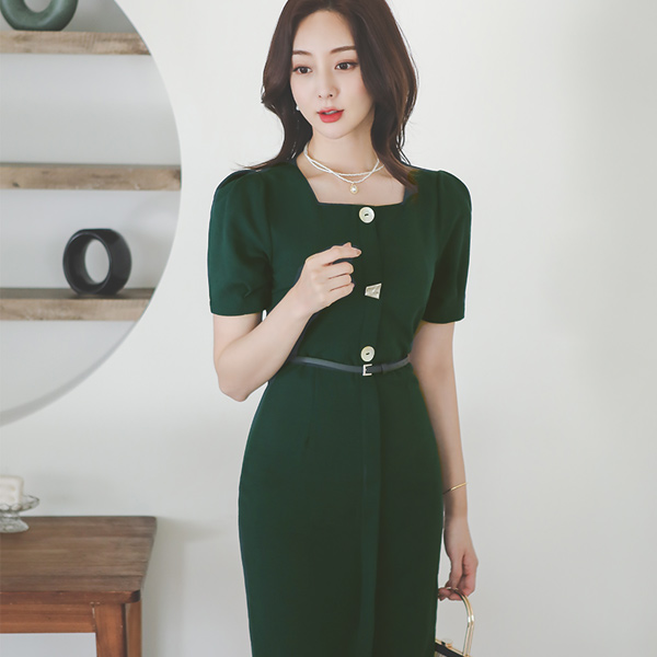 方领 螺钿纽扣 细褶 袖 连衣裙