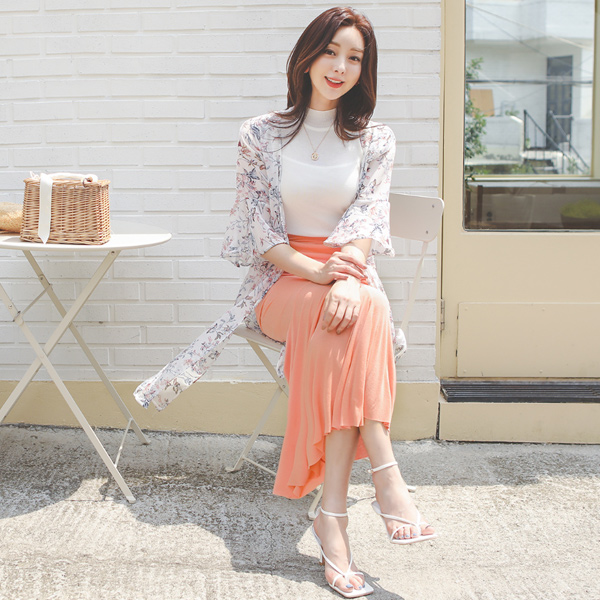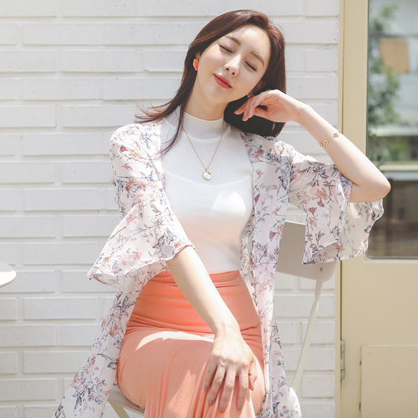 薄型织物 花纹 荷叶边袖 雪纺 长袍