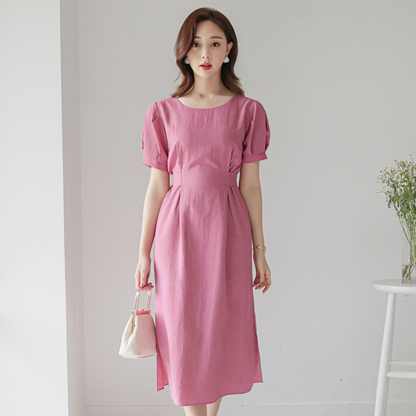 亚麻 细褶 泡泡袖 蝴蝶结 连衣裙
