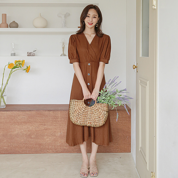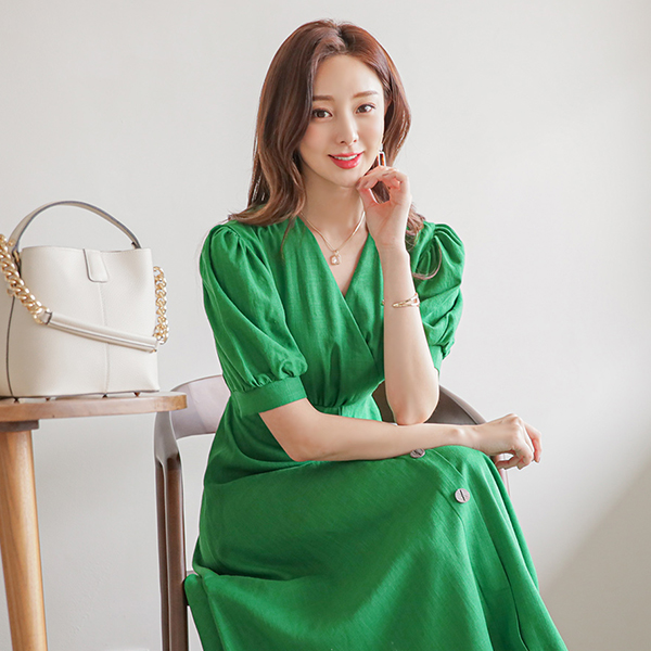泡泡袖 木纹扣子 裹身风格 喇叭 连衣裙