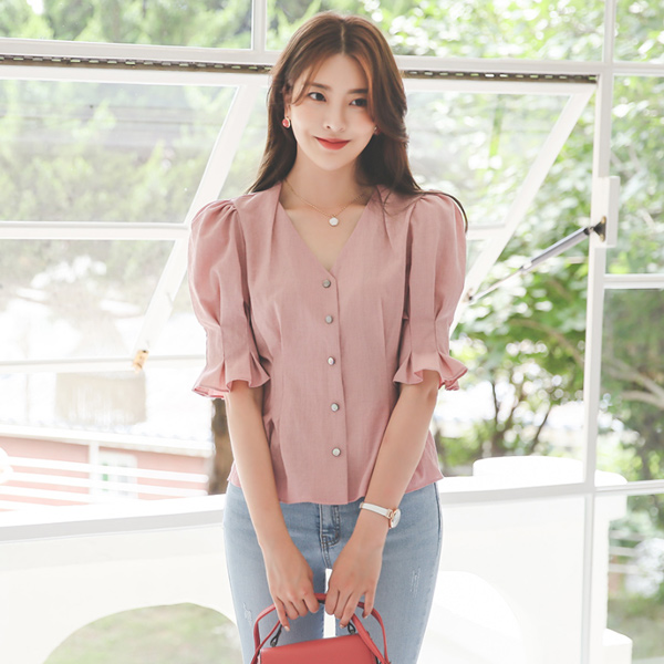 翻盖式 V字领 细褶 褶边 曲线 罩衫