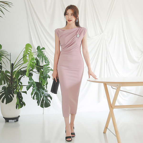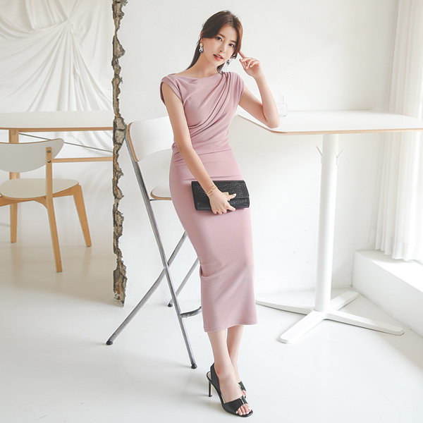 华丽 悬垂式 褶皱 不规则 肩膀 连衣裙