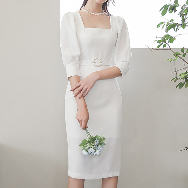 珍珠环 腰带 深四角领 灯笼袖 弹力 连衣裙