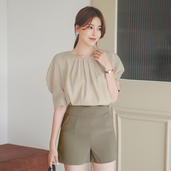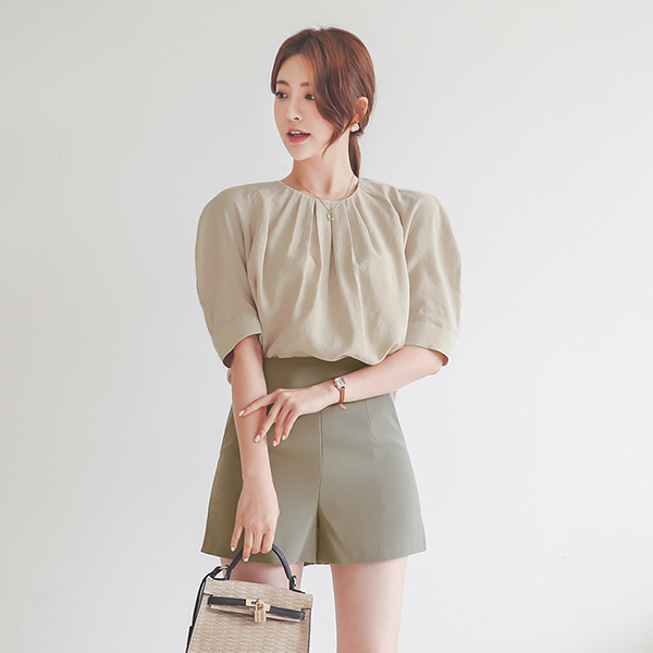 丝滑 去皱纹 灯笼袖 细褶 圆领 罩衫