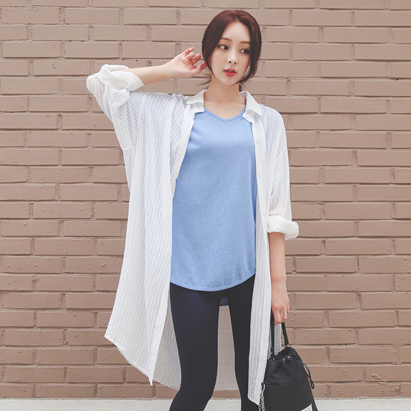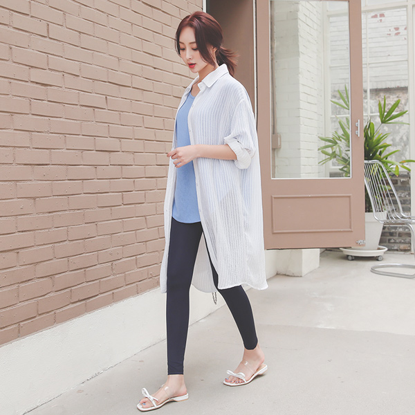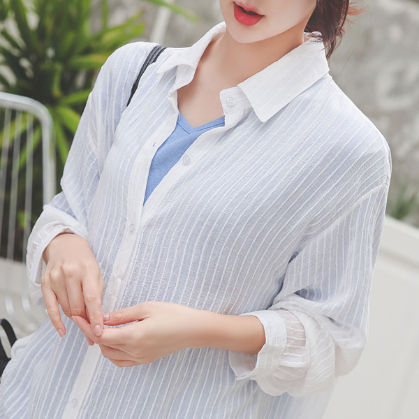 凉爽 条纹 去皱纹 长款 长袍 衬衫