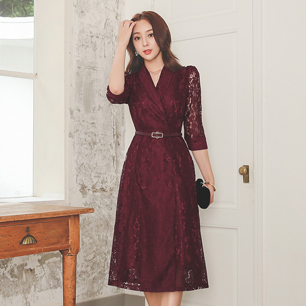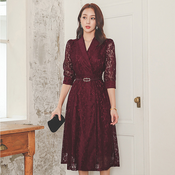 披巾领 蕾丝 双排扣 喇叭 连衣裙