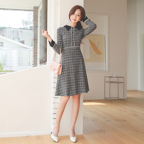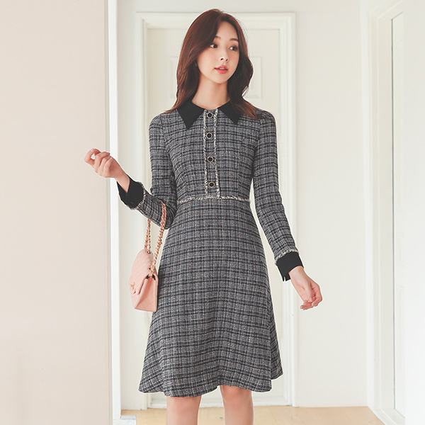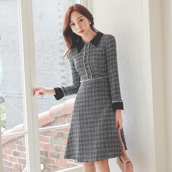 翻领 流苏 装饰 粗呢 连衣裙