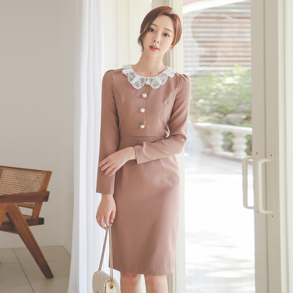 褶裥 蕾丝 领子 珍珠 连衣裙