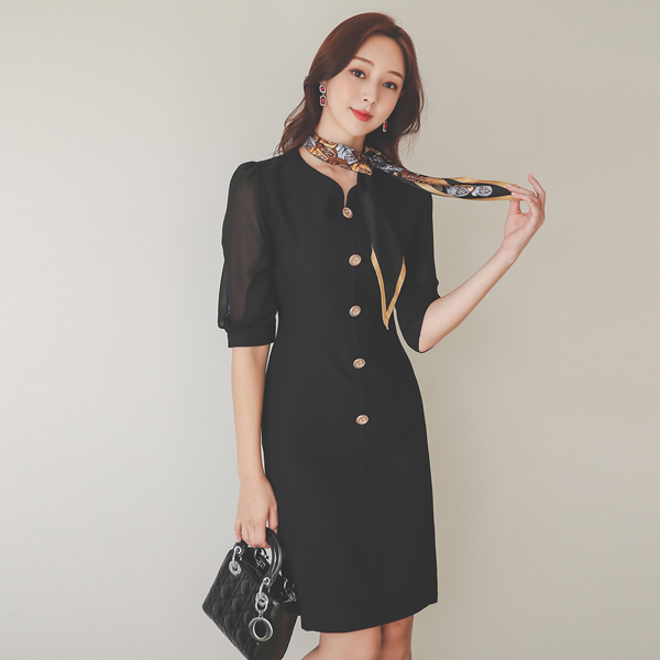 雪纺 袖子 金色纽扣 心形领 连衣裙