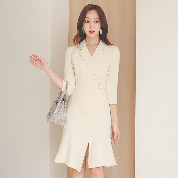 新月般 不规则 开叉 카라랩 弹力 连衣裙