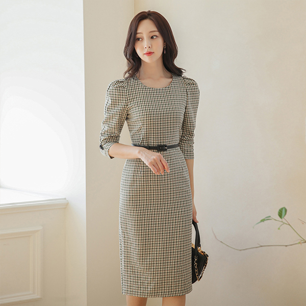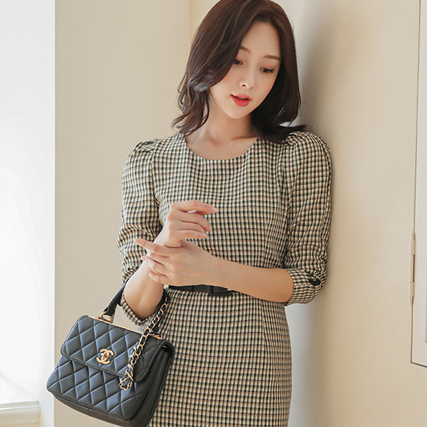 长方格 格子 褶皱 袖子 束带 连衣裙